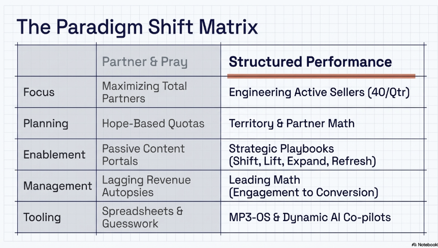 While the traditional model relies on partner counts and passive participation, Structured Performance Partnering focuses on engineering predictable revenue through active seller engagement and disciplined execution.